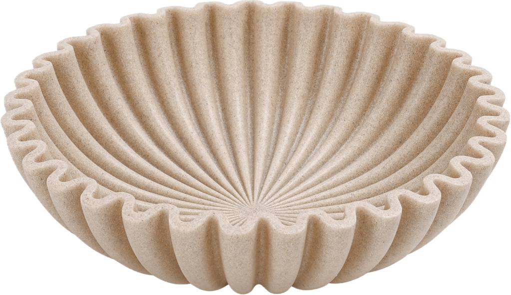 A little more structured, this bowl has a classic silhouette and warm beige tone. It fits perfectly on an entry table or bookshelf, and the neutral color blends seamlessly with natural materials like wood, linen, and marble. Click here to see the travertine centerpiece bowl.