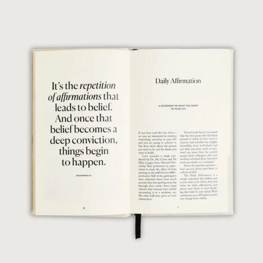 One of the things I love most about The Five Minute Journal is how beautifully designed it is. With its linen-textured cover and clean layout, it’s something I actually want to leave out on the coffee table or nightstand. It looks more like a decorative object than a planner — which, for a design lover like me, makes all the difference.